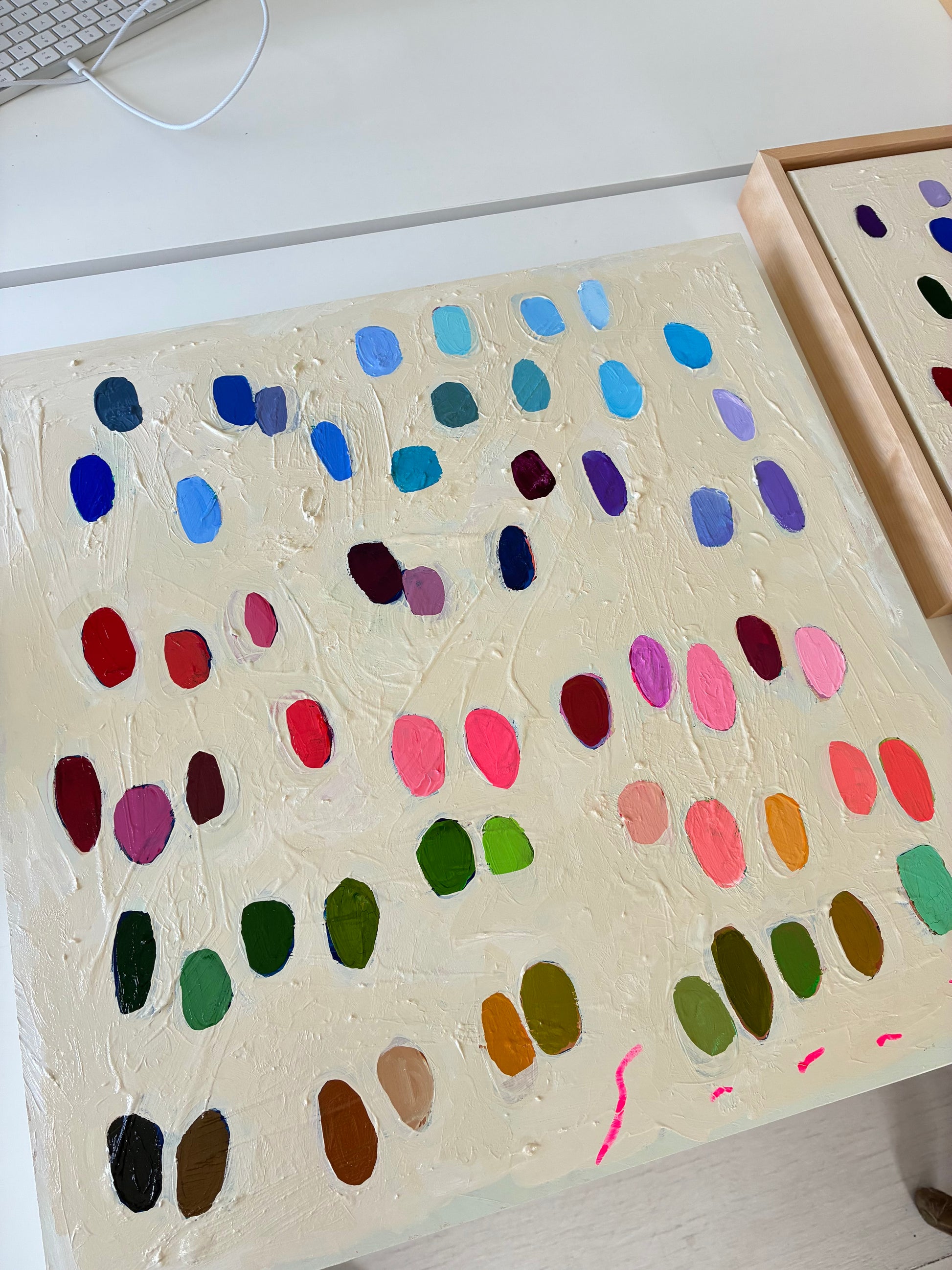 This 20" x 20" painting is made on 1.75" deep cradled wood panel and comes unframed ready to hang with the sides painted taupe.