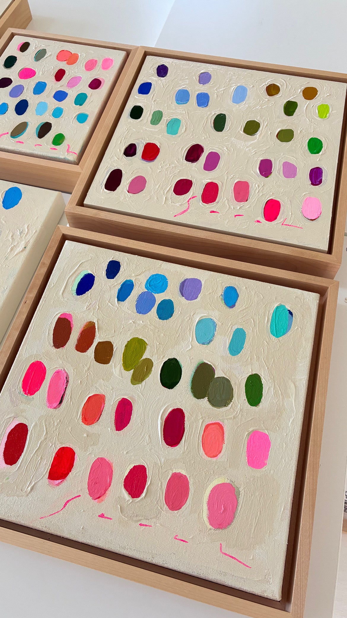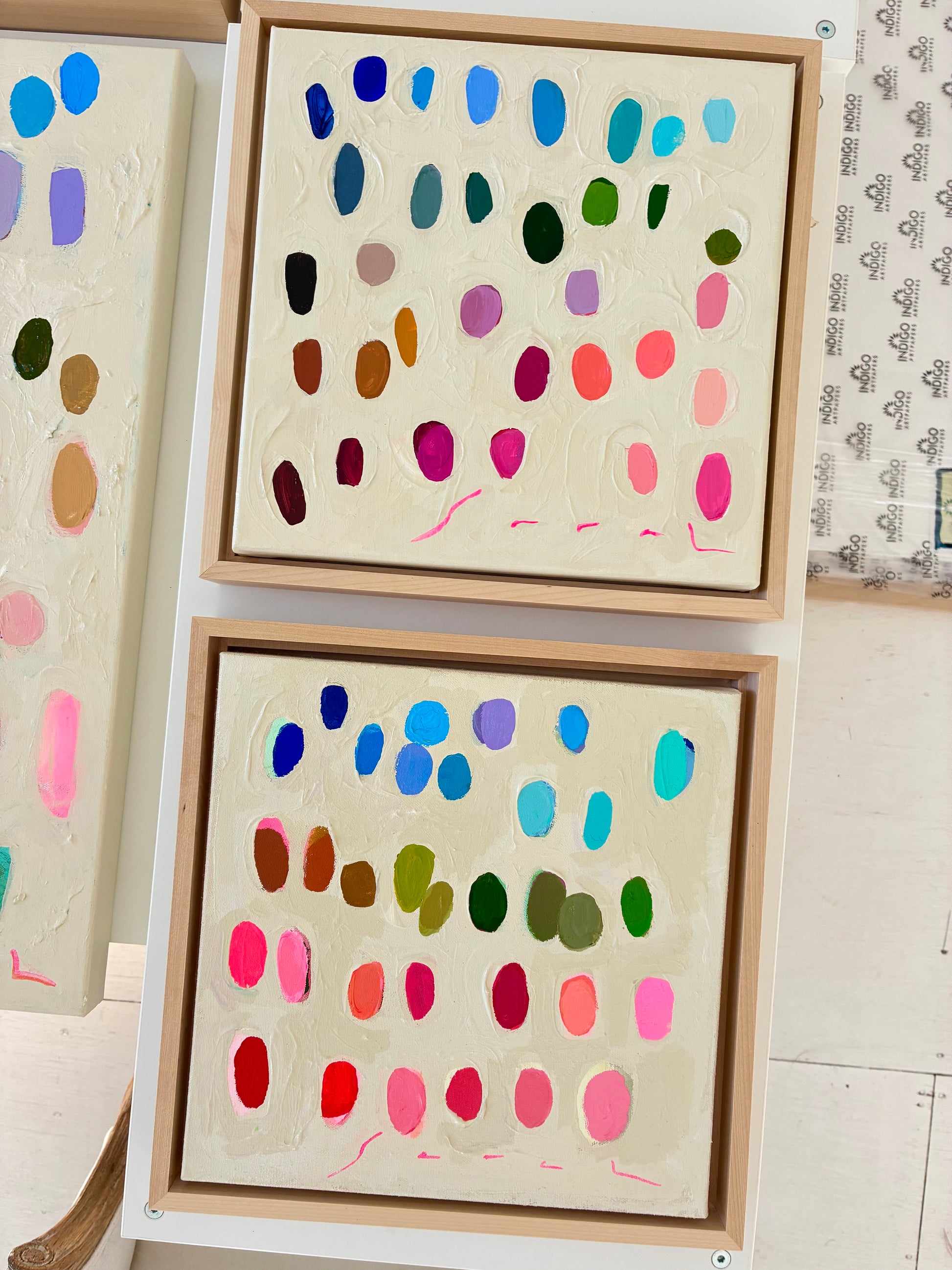 This 12"x12" painting is framed in a 13” x 13” x 2” deep wood float frame as pictured.